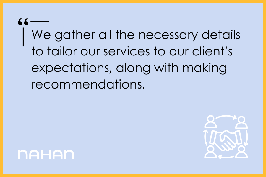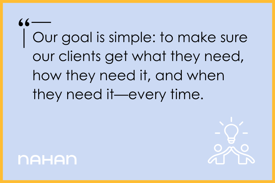 At Nahan, we understand that each client’s needs are unique, and delivering exactly what they want, how they want it, on time is our top priority. Our Client Services Team plays a pivotal role in ensuring a seamless, efficient, and personalized experience from the moment we learn of an opportunity to the final delivery. Here's how we work to make sure we're aligned with our clients’ expectations, and how we ensure everything is delivered to the right place, at the right time, and in the right way.