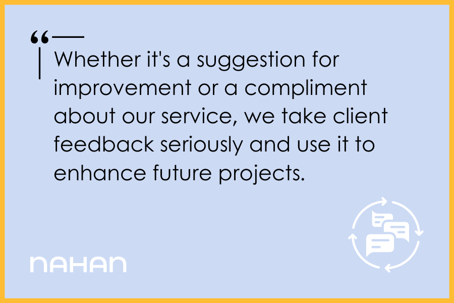 - Feedback Loops: We encourage open feedback from clients, which helps us continually improve our processes. Whether it's a suggestion for improvement or a compliment about our service, we take client feedback seriously and use it to enhance future projects.