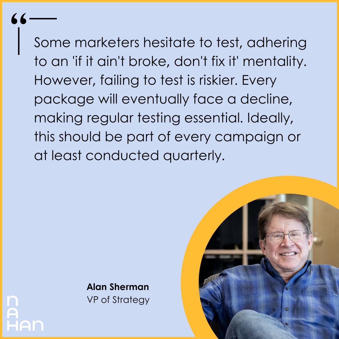• Solution: We talk about testing all day, everyday at Nahan. Why? Because we believe it makes a night and day difference in your ROI. We find that most of the time, marketers just don’t know where to start with testing, and so out of fear, they don’t test. But when viewed as a long-term investment, it’s risky to not test in direct mail testing. If you’re ready to test smarter and drive ROI for your program, download “A Guide to Direct Mail Testing Today” for marketers both new to and familiar with testing. From research, pre-testing, testing, and post-campaign assessment, we cover it all.