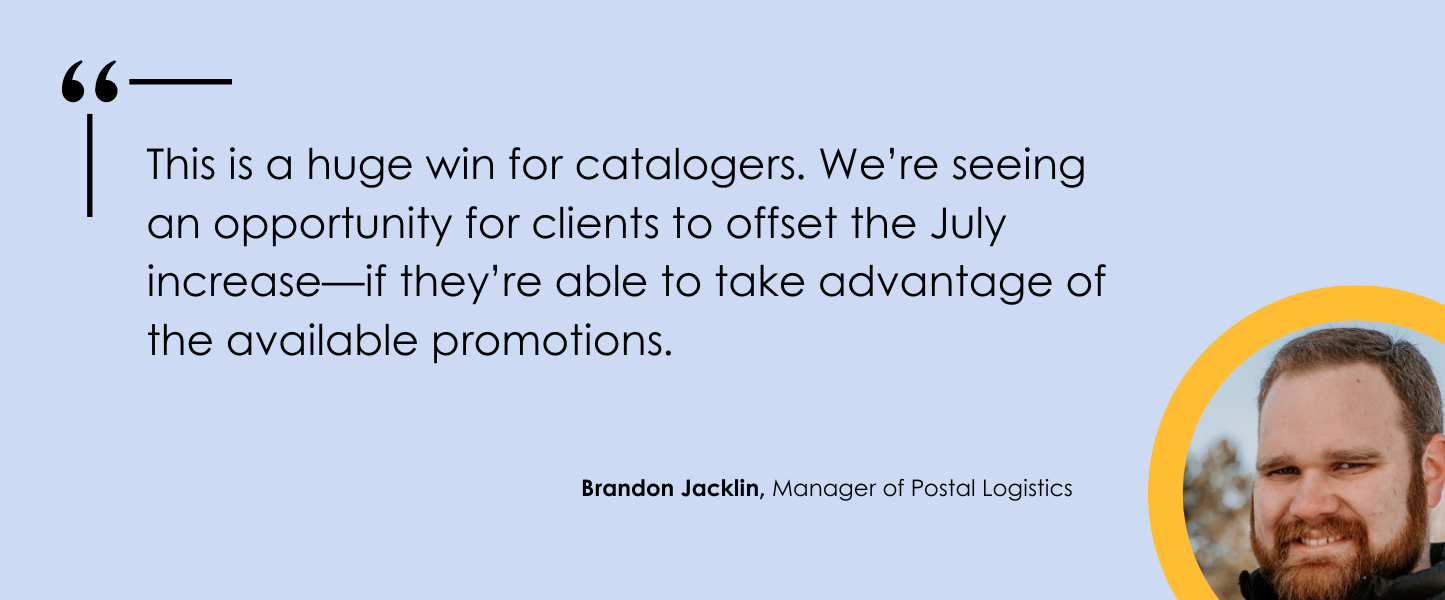 “This is a huge win for catalogers,” says Brandon Jacklin, Nahan’s Manager of Postal Logistics. “We’re seeing an opportunity for clients to offset the July increase—if they’re able to take advantage of the available promotions.”