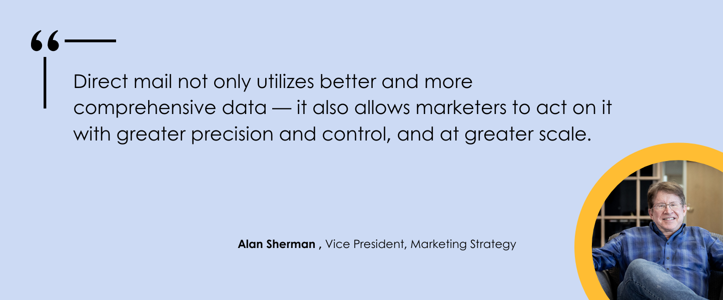 Direct mail not only utilizes better and more comprehensive data — it also allows marketers to act on it with greater precision and control, and at greater scale.